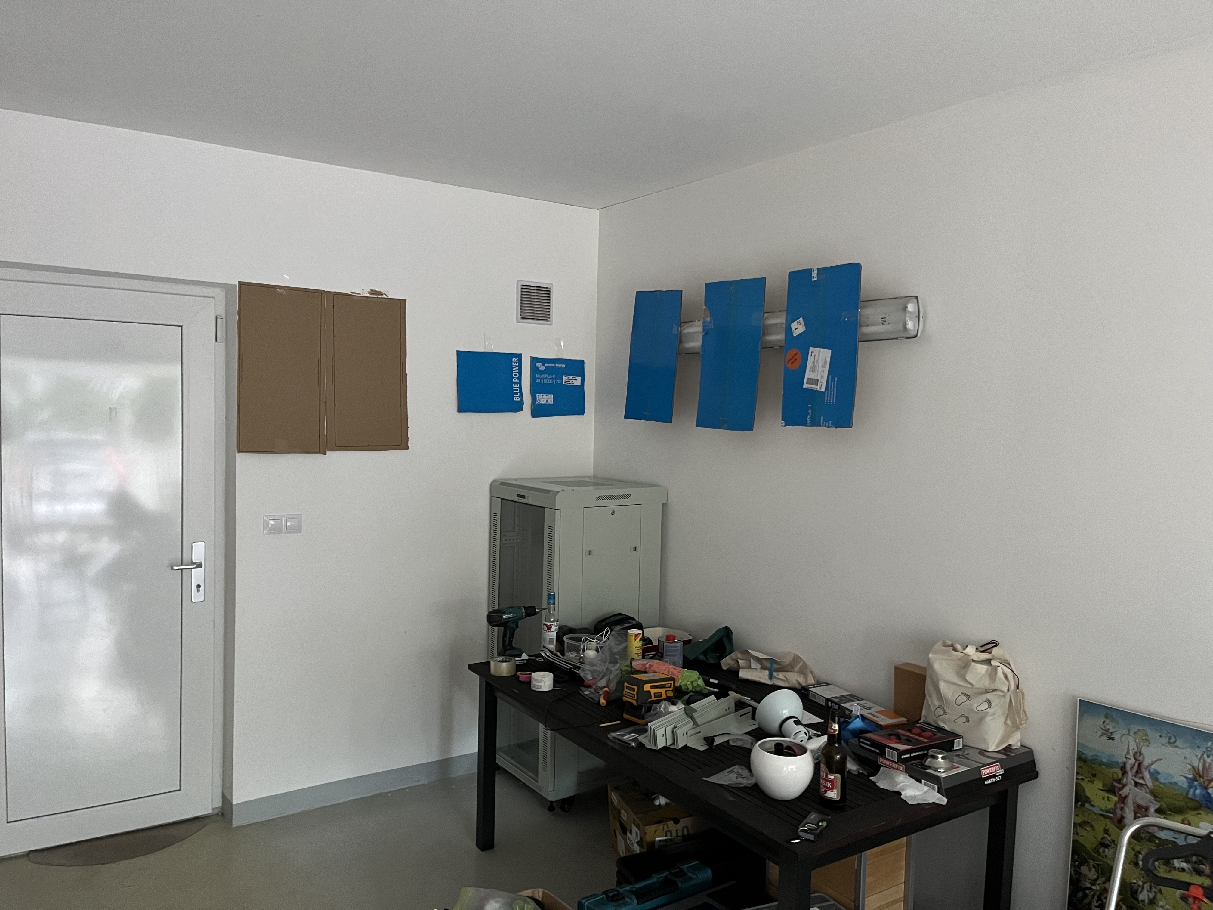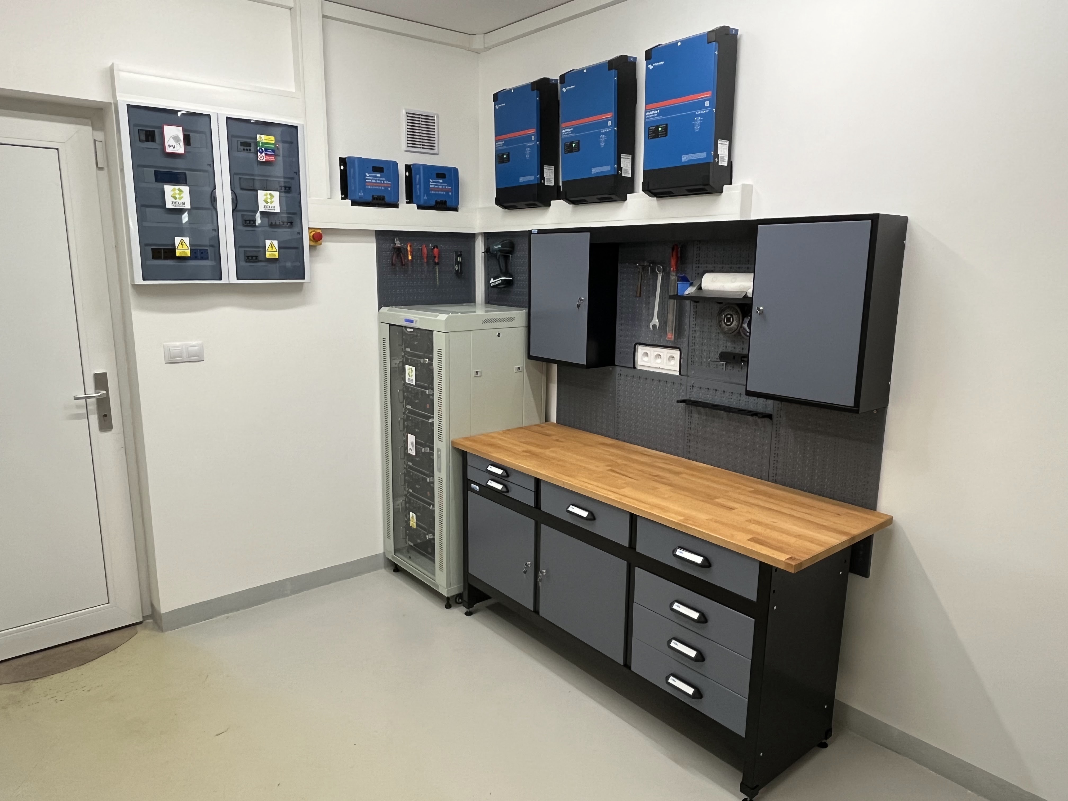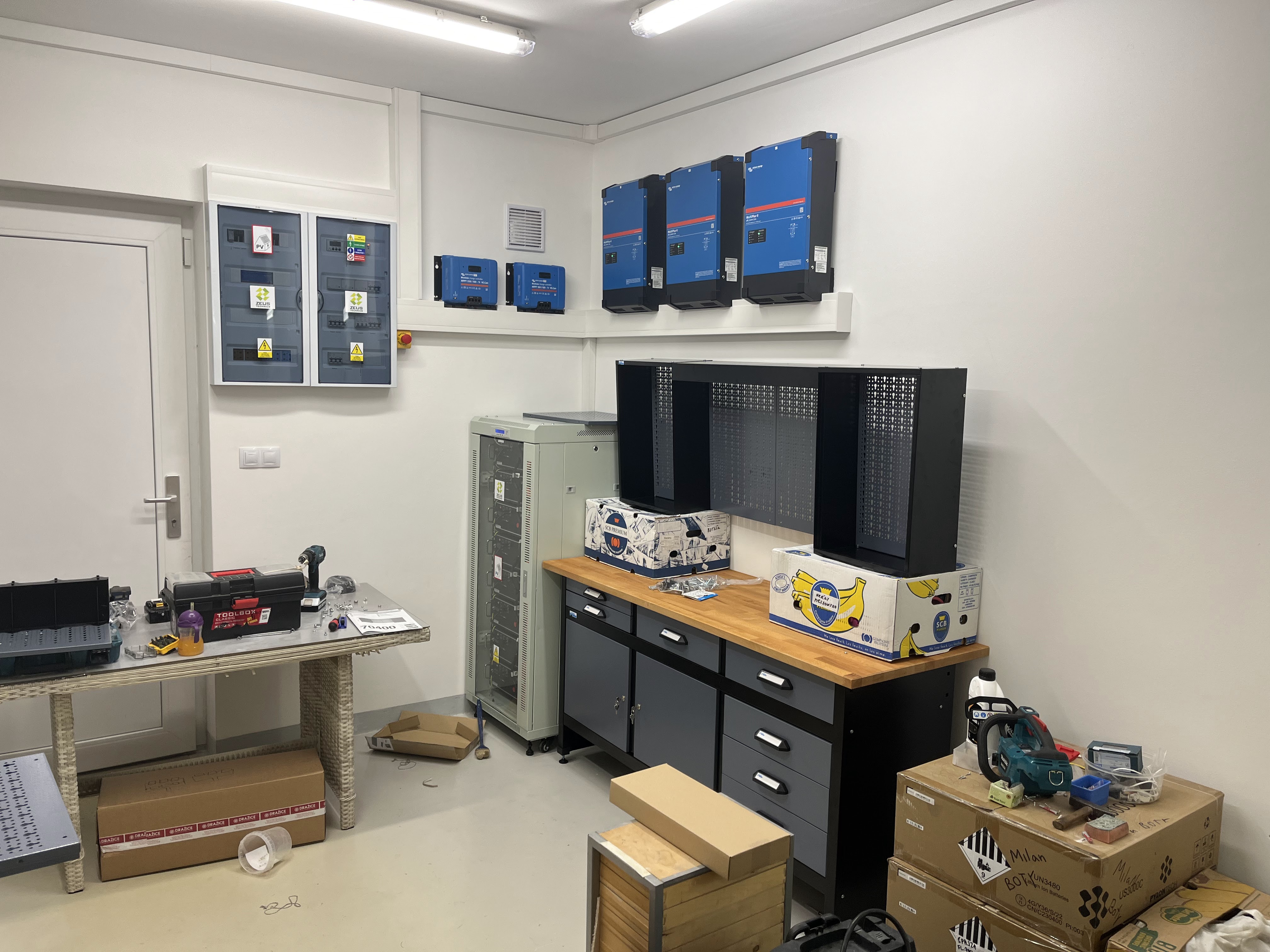vytvoření simulace technologie na zdi pomocí atrap zařízení Victron (v našem typickém modrém provedení),