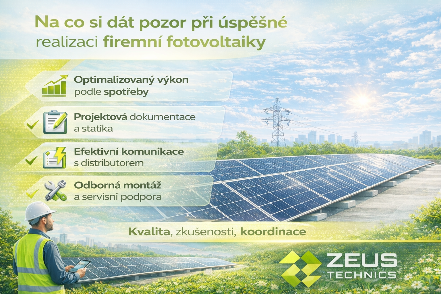 Ve společnosti Zeus Technics klademe důraz na komplexní přístup – od technického návrhu přes administrativu až po dlouhodobou podporu klienta. Díky tomu mohou firmy využívat výhody vlastní výroby energie bez zbytečných rizik a komplikací.