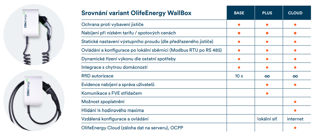 OlifeEnergy WallBox je nabízen ve variantách BASE, PLUS a CLOUD. Porovnání jednotlivých variant je zde.