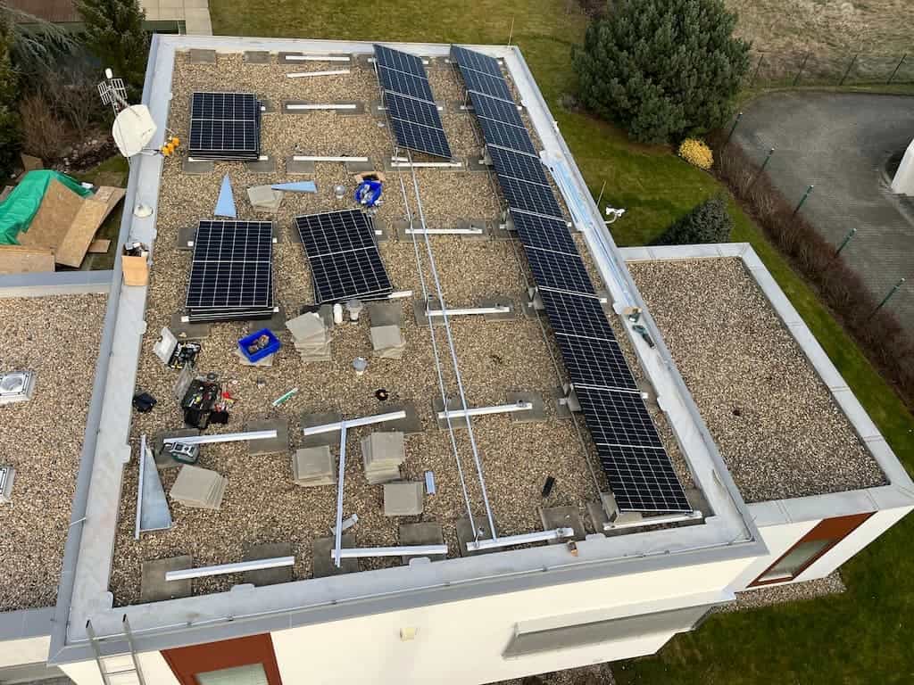 Samotná instalace si vyžadovala nestandardní řešení uložení panelů. Vzhledem typu střešní krytiny by se konstrukce položená na kamenech mohla časem propadat a deformovat. Nejdřív se proto museli odstranit oblázkové kameny a zafixovat místa uložení konstrukce. Následně se znovu oblázky roztáhli po střeše, aby místa posílení zakryli. Konstrukce se přímo kotvila do betonových záteží tak, aby panely nebyly zbytečně vysoko nad povrchem střechy. Výsledkem byl splněn požadavek, že ze silnice není téměř panely vidět. Umístění samotné technologie je v garáži, do které byl vytvořen kabelový přístup přes 50 mm chráničku. Místost garáže je moderní, prostranná a je v ní umístěn server. Proto klient zvolil praktickou a čistou instalaci do RACKové skříně se samostatným větráním a termostatem.
