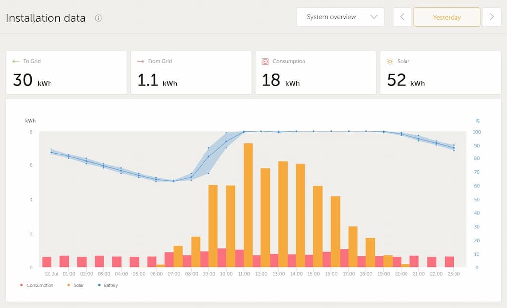 Elektrárna může fungovat v sezónním ostrovním režimu i několik měsíců. Vzhledem k aktuálním výhodným cenám výkupu energie je elektrárna nastavena na hybridní režim. Vyrobená energie primárně slouží pro potřeby domu a nabíjení elektromobilu. Přebytečná energie se nejprve ukládá do baterie a po plném nabití baterie je posílána do sítě. Před garáží byla instalována dobíjecí stanice VICTRON, která přímo komunikuje s technologií elektrárny a dokáže nabíjet elektromobil z kombinované energie FVE / síť, ale v případě potřeby umí nabíjet pouze z elektrické energie ze slunce.