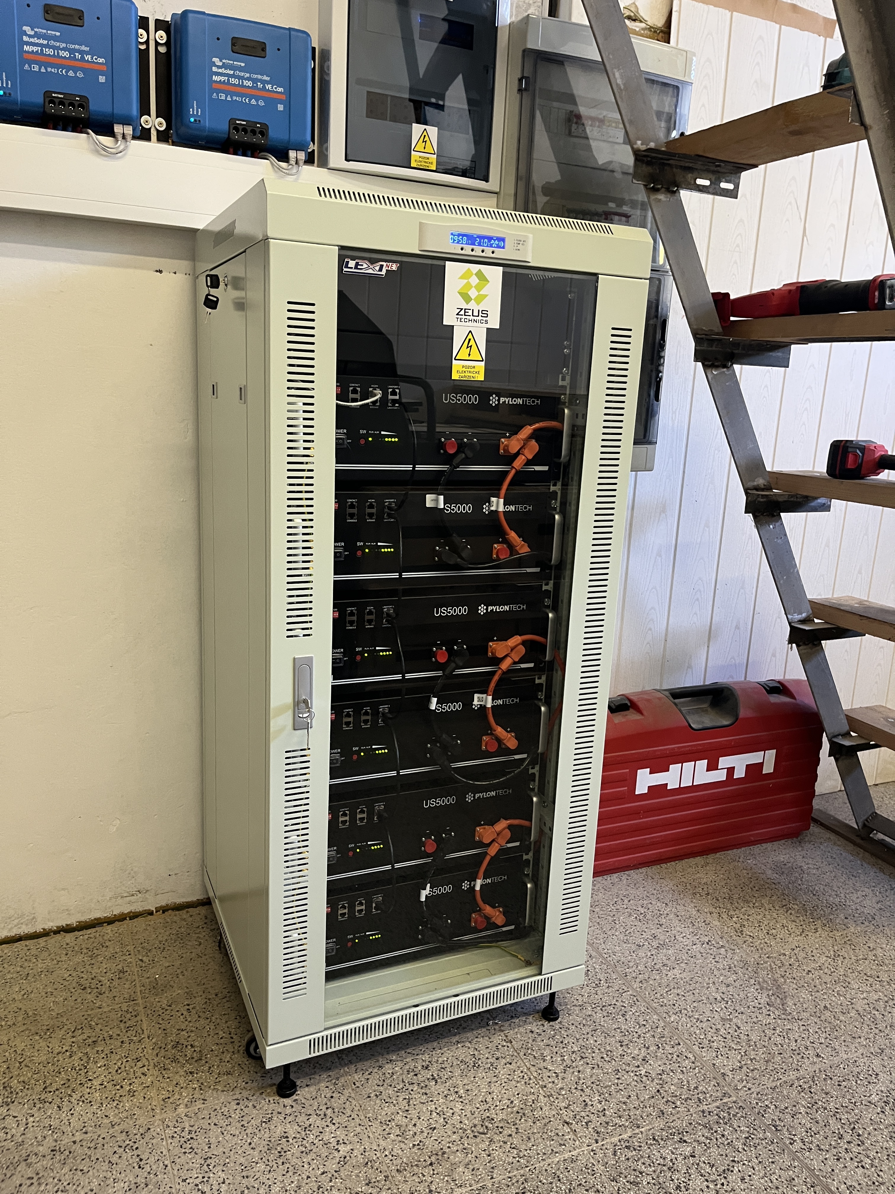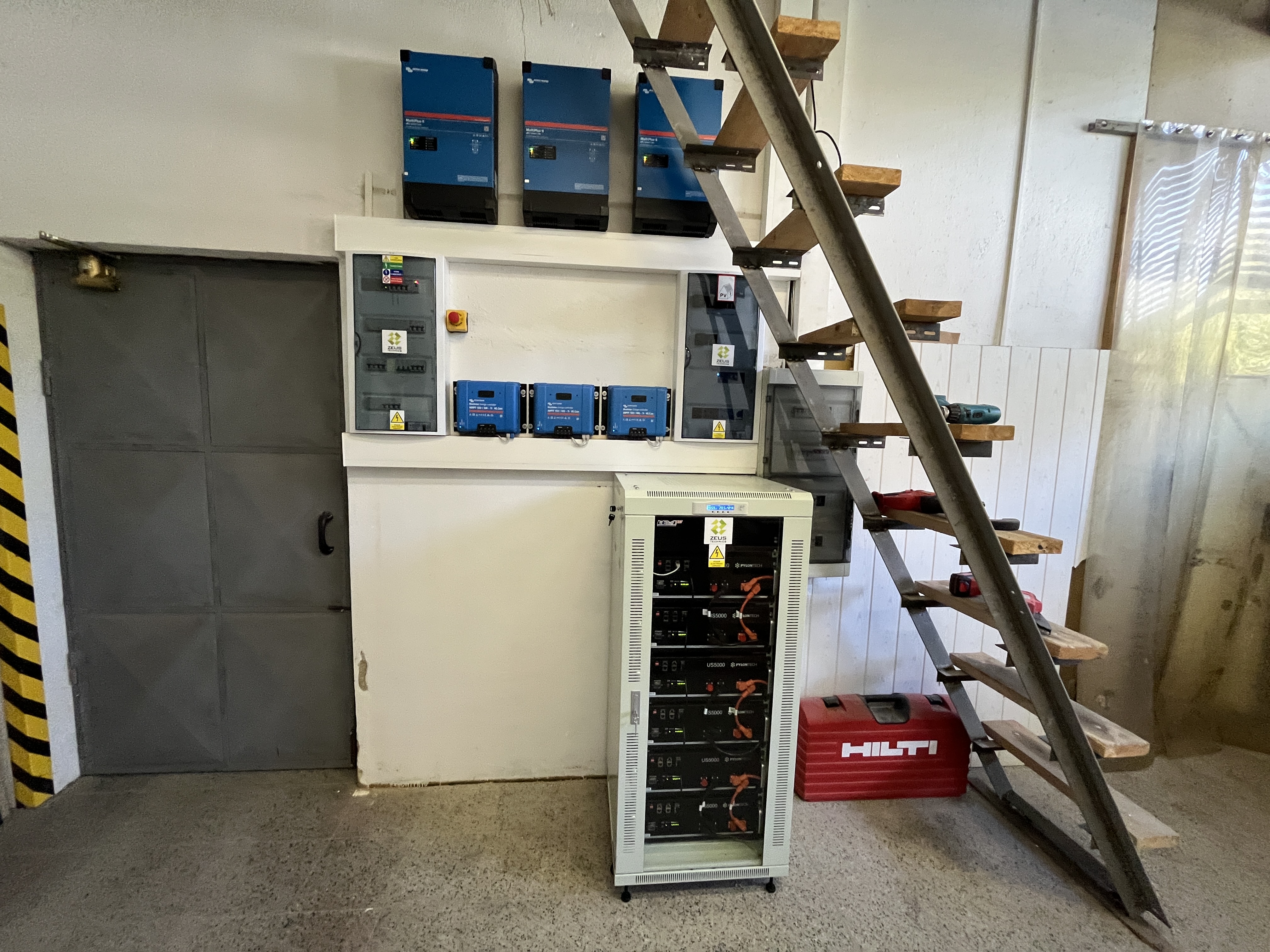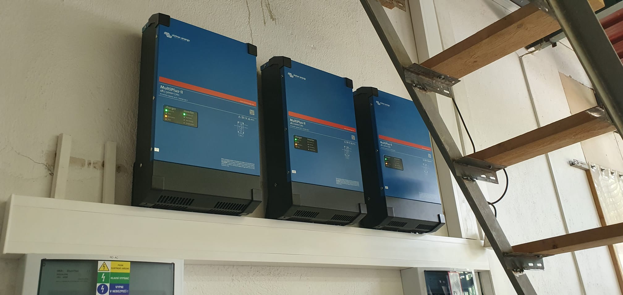 - 3× střídač Victron Multiplus II (48 V / 5000 VA)
